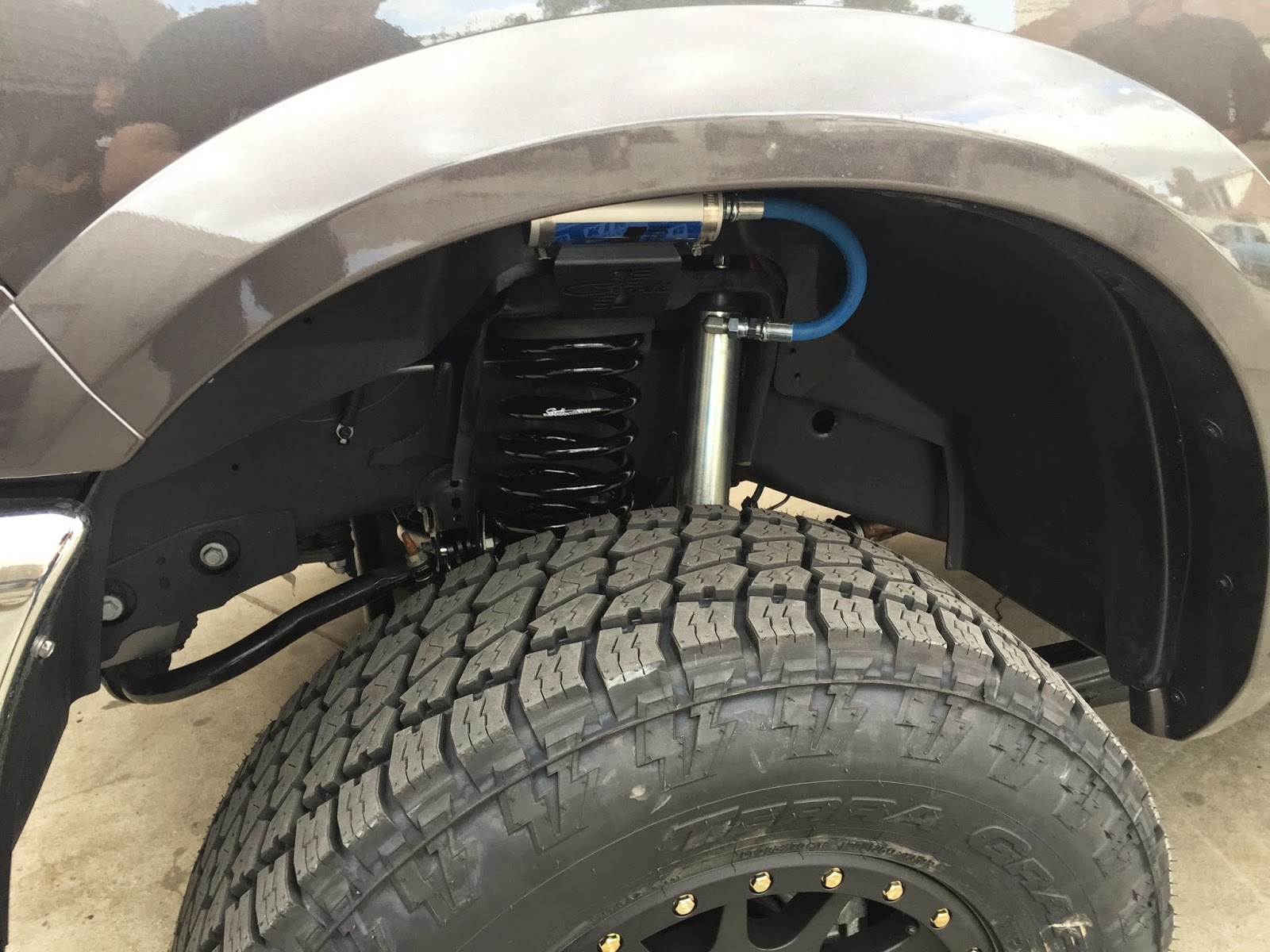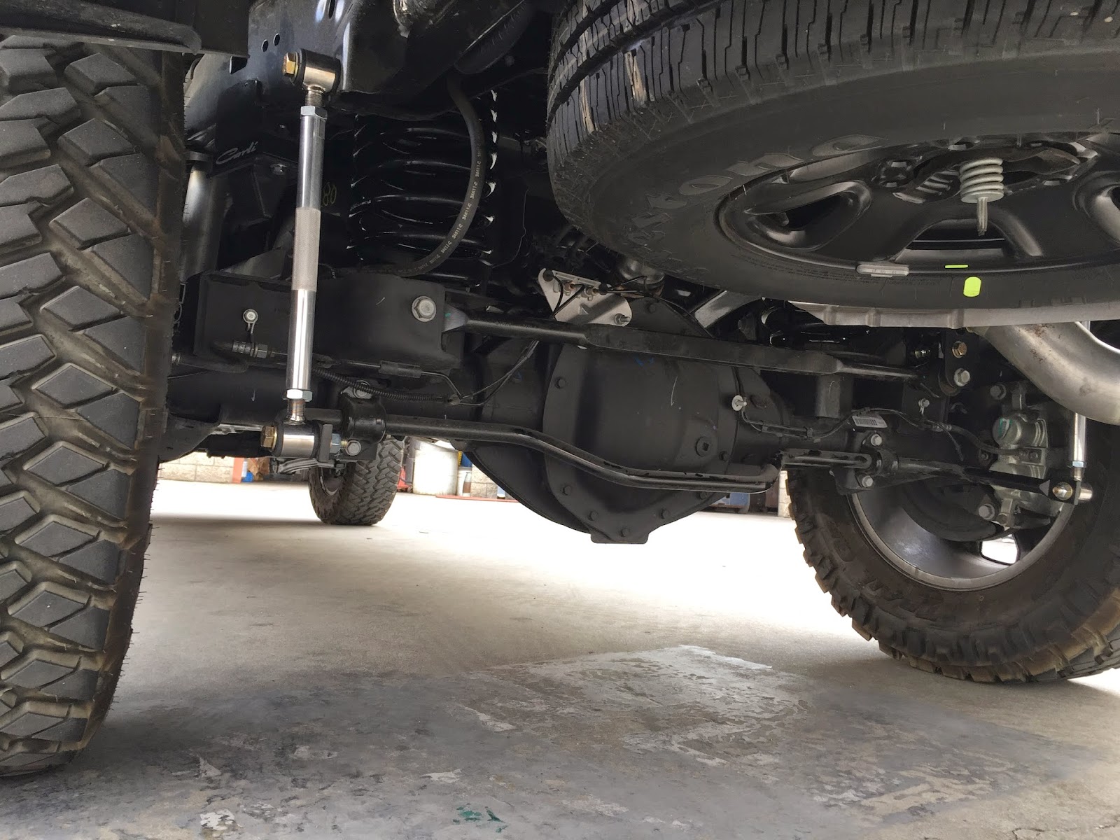 This truck is riding on factory 20" wheels and 35x12.5x20 Nitto Trail Grappler MT tires. This truck rode amazing and, just as importantly, all suspension geometry is now correct.