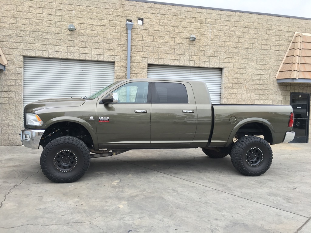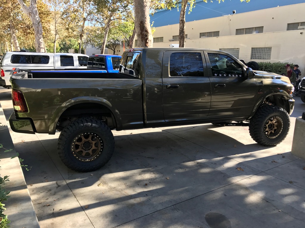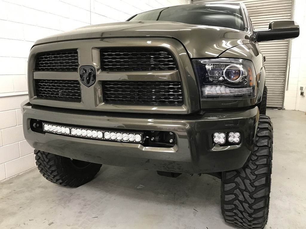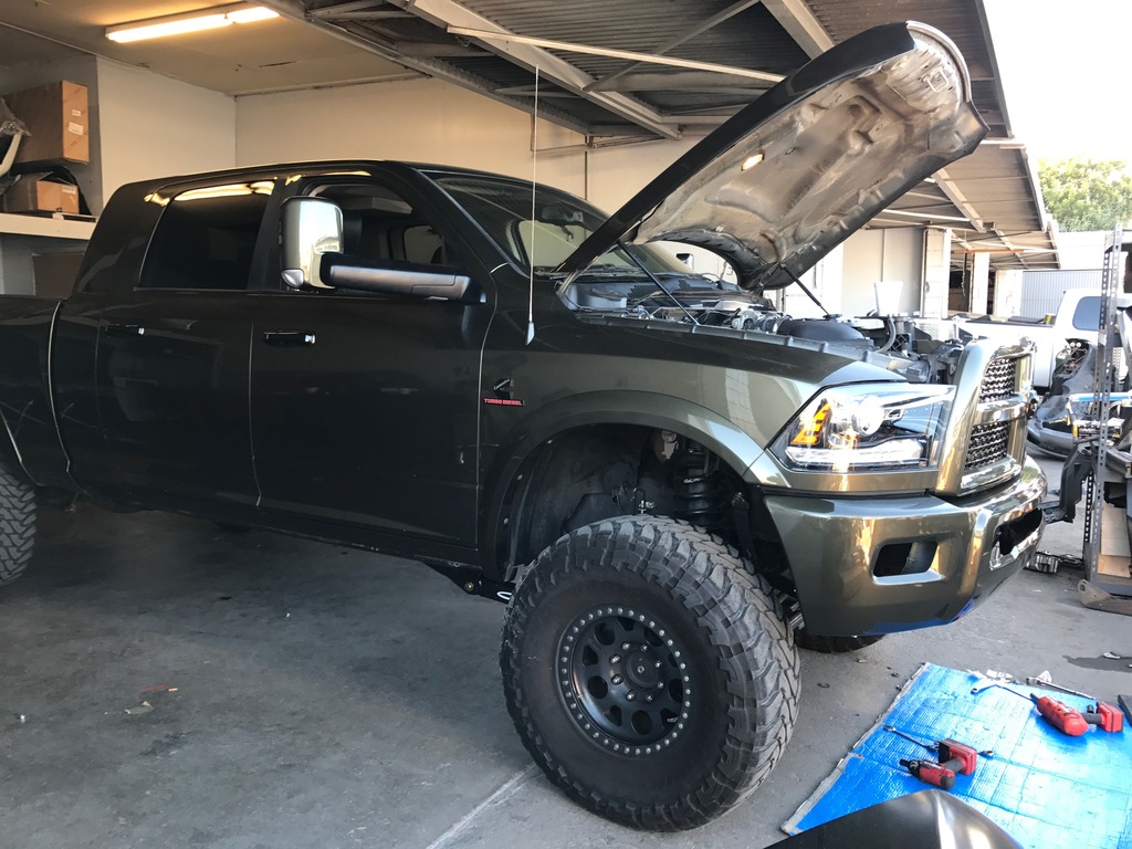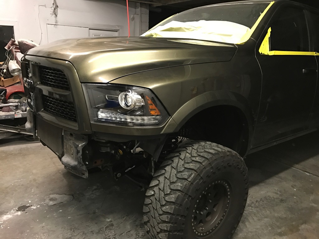 The truck had a nice look to it but we wanted to make it a little more current. The new 2016 Sport model trucks have a nice look to them and we wanted to do something similar with this one. We sent it to our friends at Autobahn Collision in Torrance, CA for a bit of an overhaul. The factory grille, headlights, front bumper, and rear bumper were removed. The grille was replaced with a 2013+ Laramie grille and the headlights were replaced with the factory black Sport style headlights: