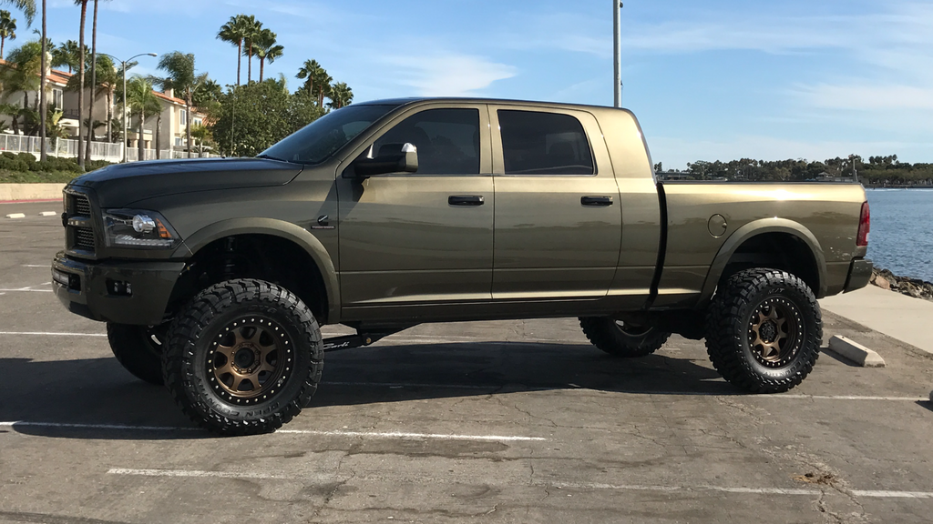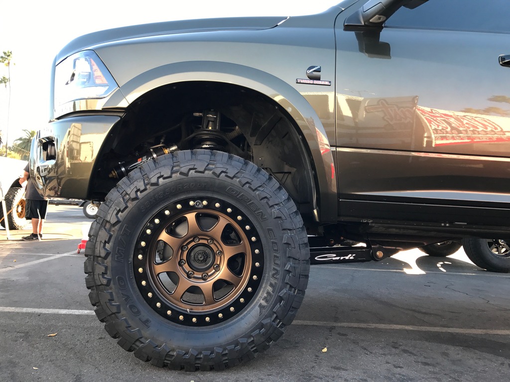 We've always liked to stuff bigger tires under our builds, so we felt it necessary to replace the 37's underneath with something bigger. We decided to go with 20" Trail Ready Simulated Beadlocks and 38x13.5x20 Toyo Open Country MT tires. In order to match the green/bronze color off the truck, we opted for a bronze powdercoat finish on the wheels. The color is Triple Bronze by Prismatic Powders. Here is how they turned out: