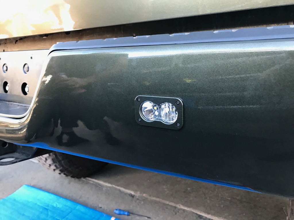 Baja Designs non-flush mount SII lights were frenched into the rear bumper to serve as backup lights: