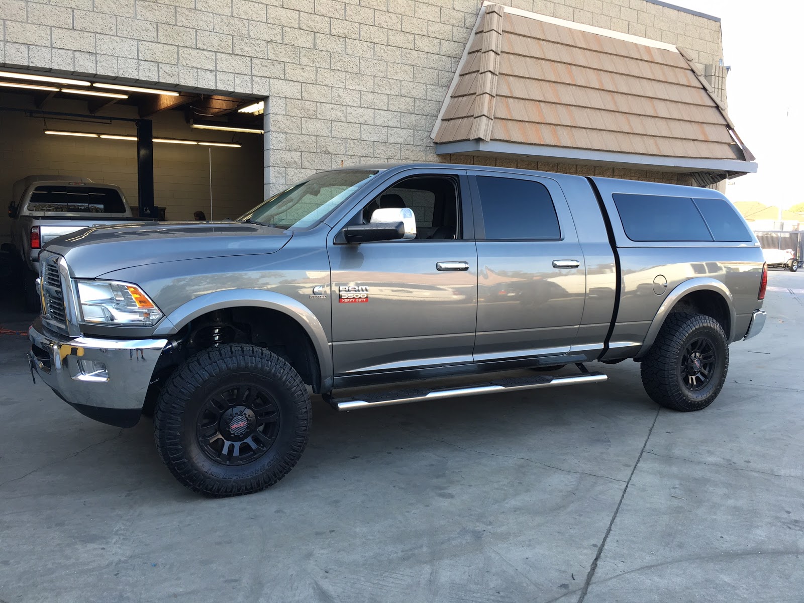 This 2012 Mega Cab features a Carli Pintop 2.5 system, a Carli Torsion Sway Bar, and Carli Full Progressive Rear Leaf Springs.