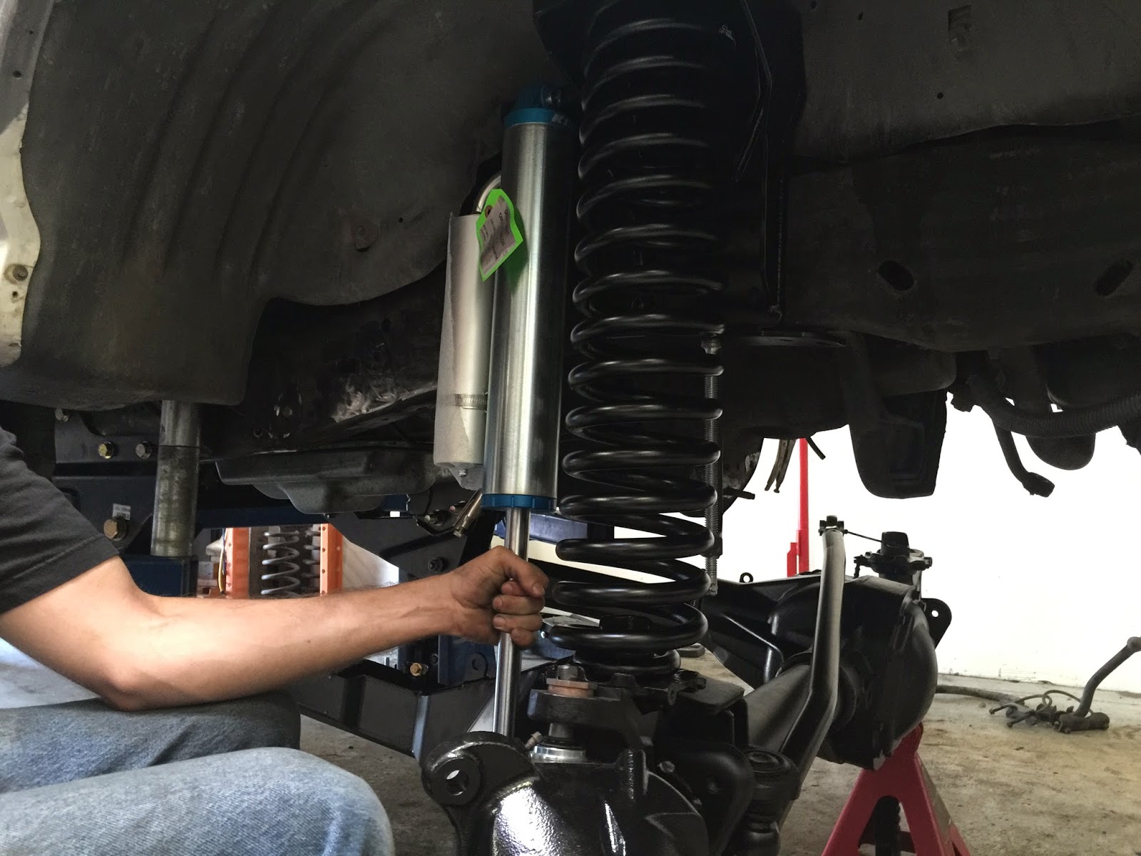 Once the radius arm brackets were measured and calculated as in the correct position, we mocked up the Carli Suspension coil buckets to get a rough idea of where they will sit in relation to the front axle.