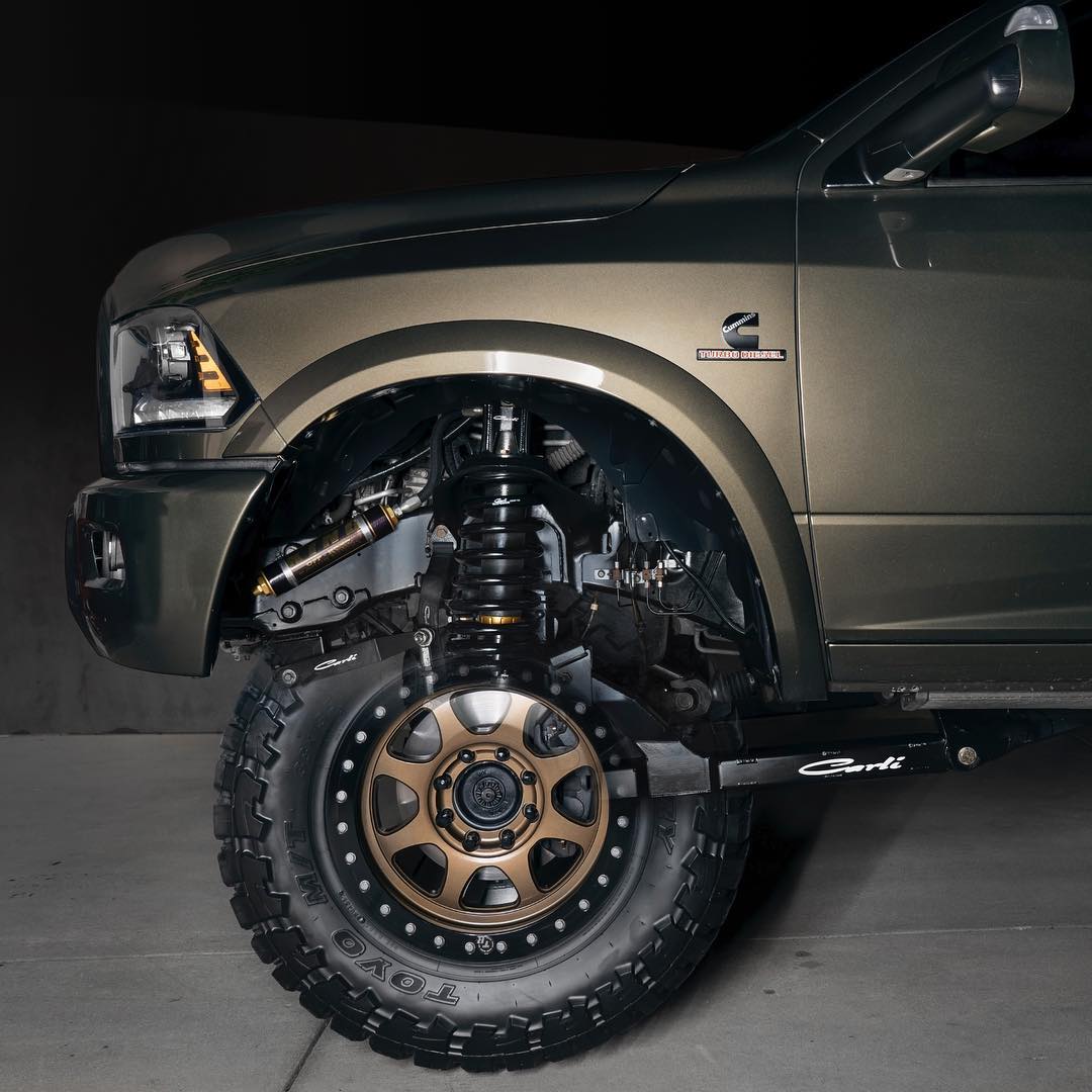 Here is shot of our shop 2014 Ram 2500 Mega Cab sporting a Carli 3" Pintop 2.5 Ram 2500 system, 17" forged Walker Evans beadlocks, and 37" Nitro Ridge Grappler tires.