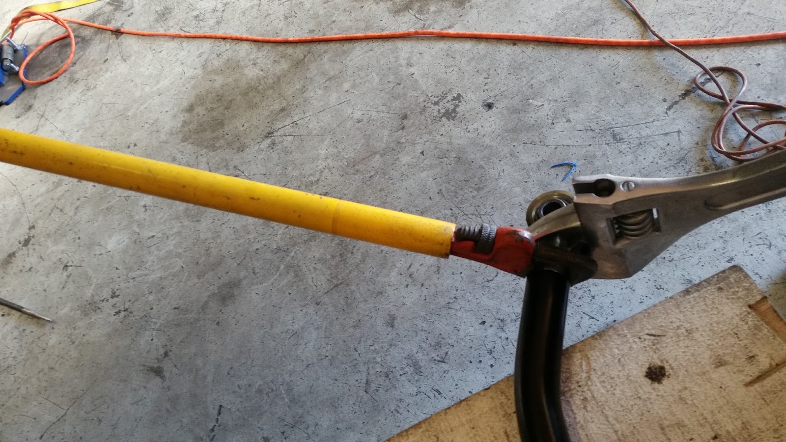 1. Jam nut on the track bar loose. Sometimes getting the jam nut on your track bar tight can seem like an impossible proposition. Don't let this little sucker get the best of you! This is one nut that you can use a big cheater bar on, because the minimum torque spec is 150ft-lbs. You can go much higher, so don't be afraid to really employ some leverage on this one. Some track bars use a high clearance nut that barely has any flats ground into it, for those I recommend a pipe wrench and a cheater pipe. You can clamp the free end of your track bar into a vice, or a press, or you can pin it into your receiver hitch. You can also pin it into the track bar mount and let the bar stick out through the wheel well so you can let it rest on your knee while you tighten the heim or Johnny Joint end. Don't forget the thread locker.