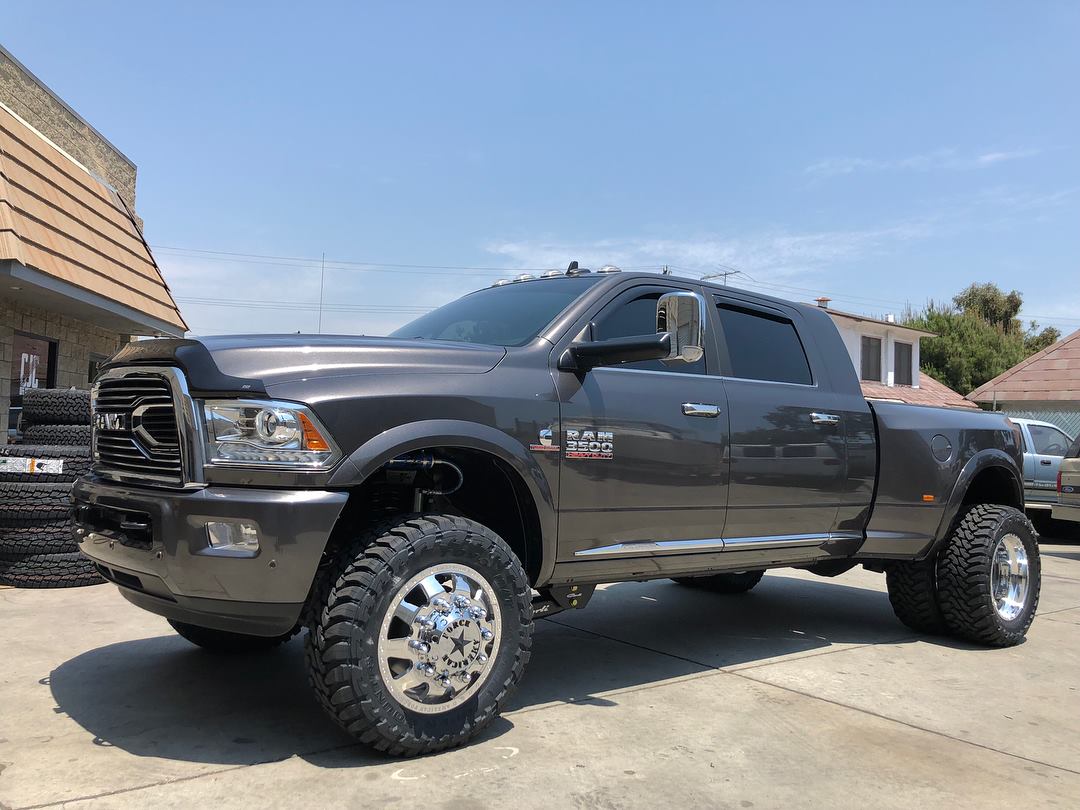 The clean dually Mega Cab is running a Carli Pintop Ram 3500 3" Lift with Carli Fabricated Radius Arms, 20" American Force wheels, & 35" Toyo Open Country MT tires.