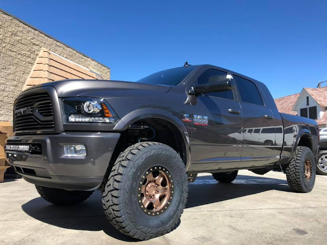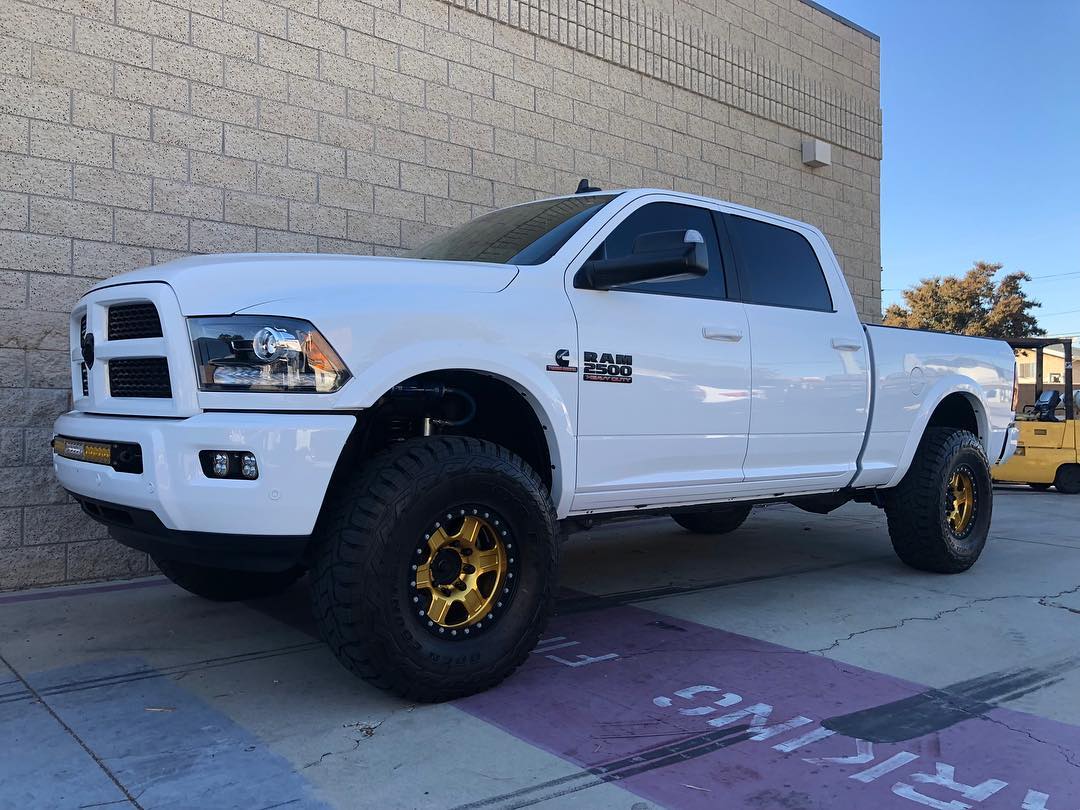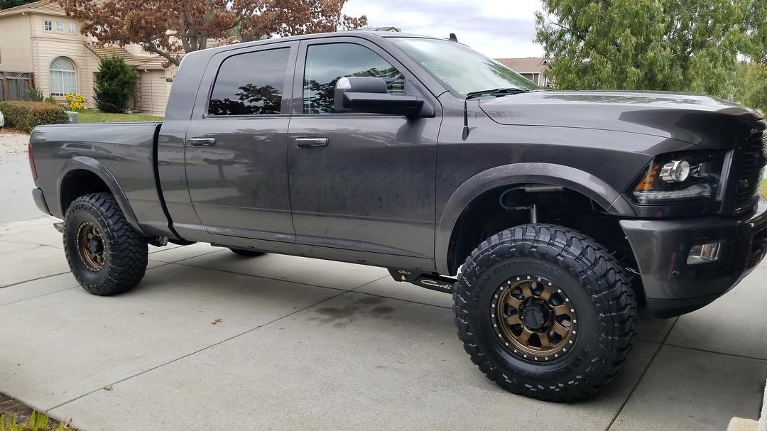 Jake's Mega Cab 2500 looking great sporting a Carli Pintop 2.5 2500 3" Lift with Carli Fabricated Radius Arms, 17" Raceline Avengers powder coated triple bronze, & 37"Toyo Open Country MT's.