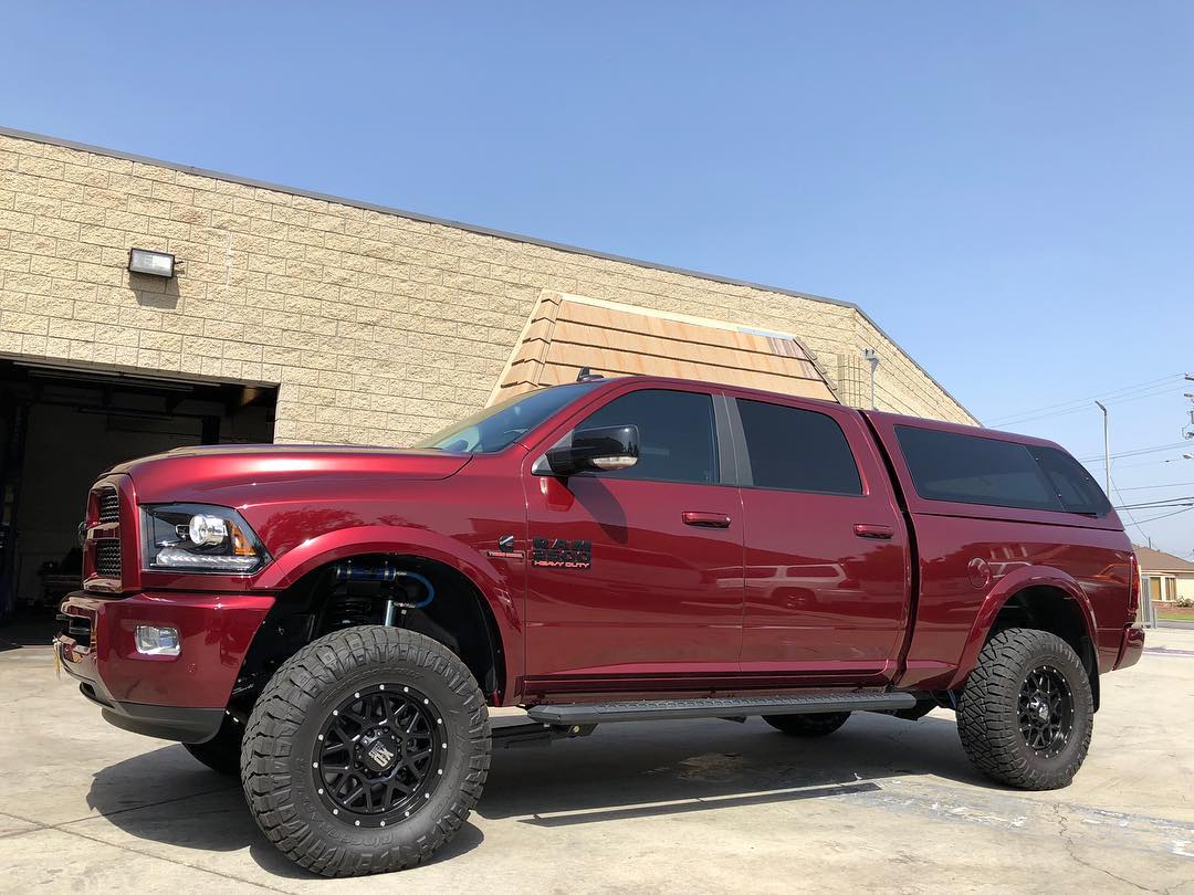 This Delmonico Red Ram 2500 is running a Carli Pintop Leveling Kit, 18" XD Series wheels, & 35" Nitto Ridge Grapplers.