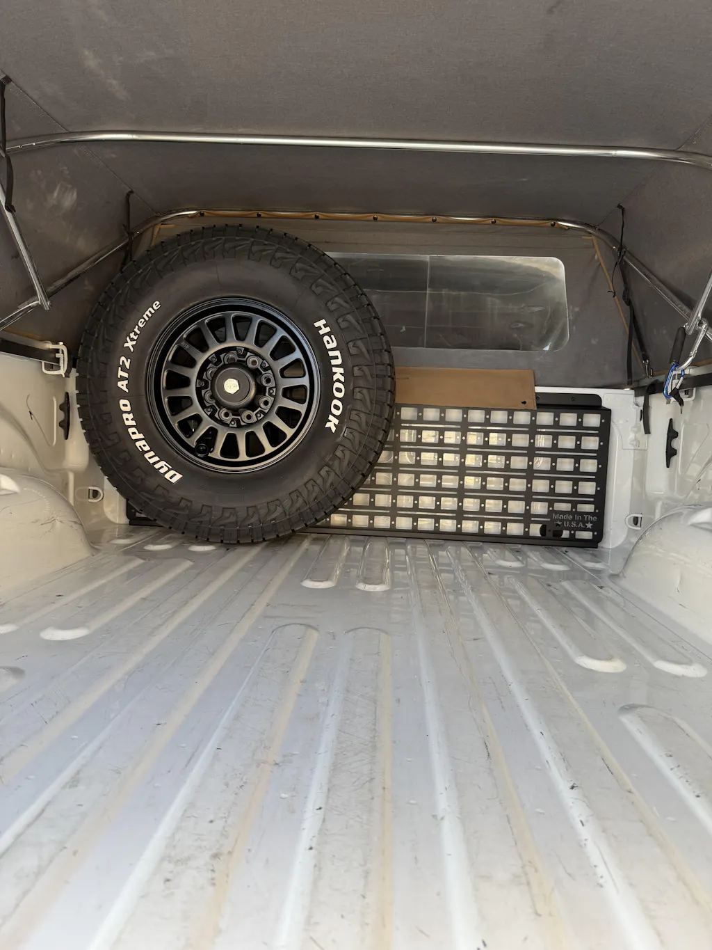 Solving the full size spare tire storage issue, this CJC Built Spare Tire Carrier allows you to mount a 35-37" spare in the bed of your truck using this carrier and a CJC Built Ram Bulkhead panel or Ford Bulkhead Panel. This tire carrier is fully adjustable along the bulkhead of your truck without the need to drill more holes. Additionally, it can easily be pulled off if you want to set your truck bed up with different gear.